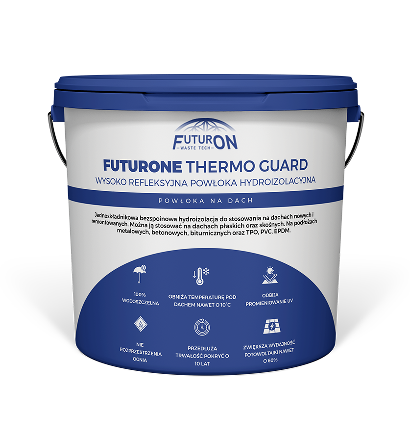 Powłoki termorefleksyjne FUTURONE odbijają 85-90% ciepła słonecznego, tym samym, do nasłonecznionej bryły budynku (dach i elewacja) dociera tylko 10% ciepła słonecznego.